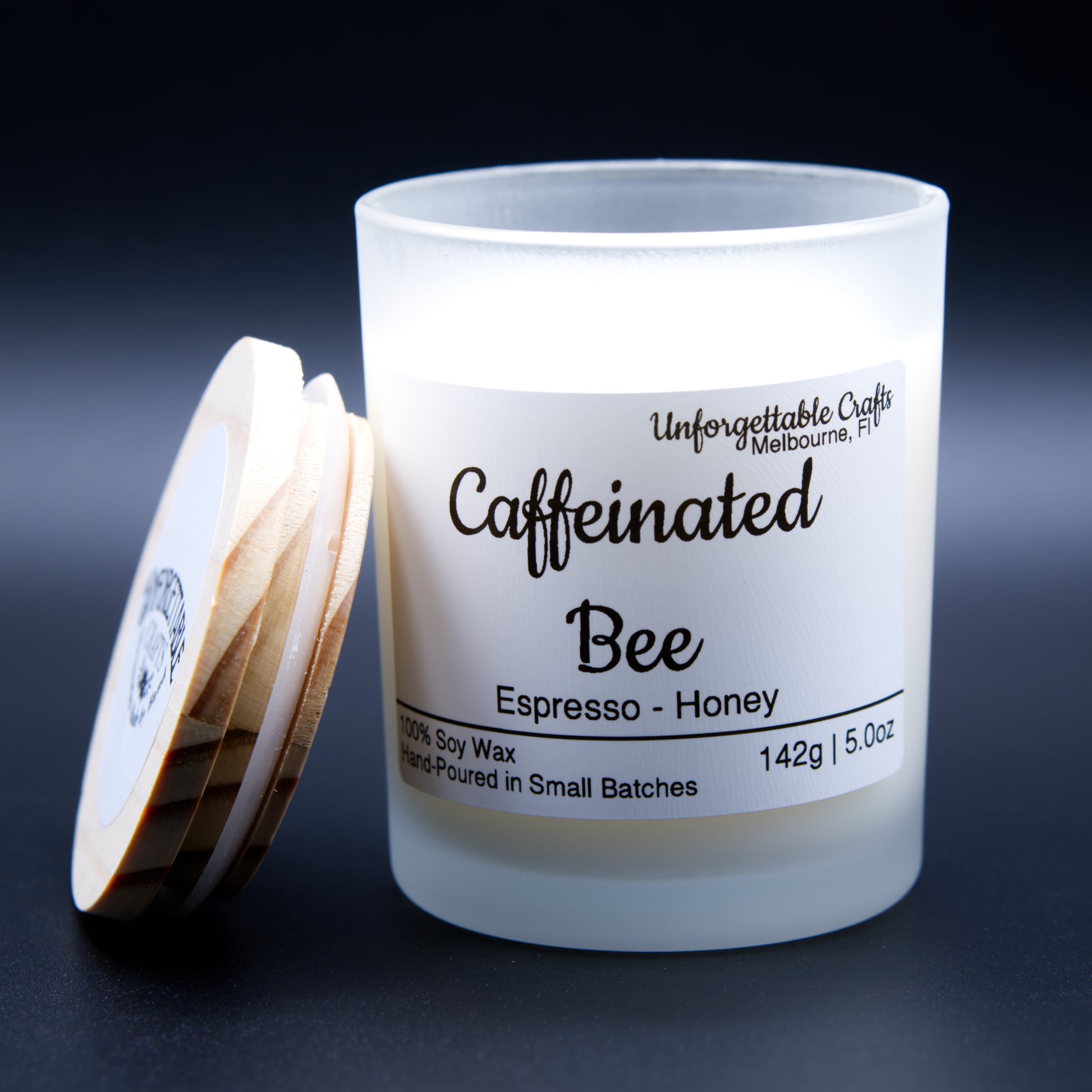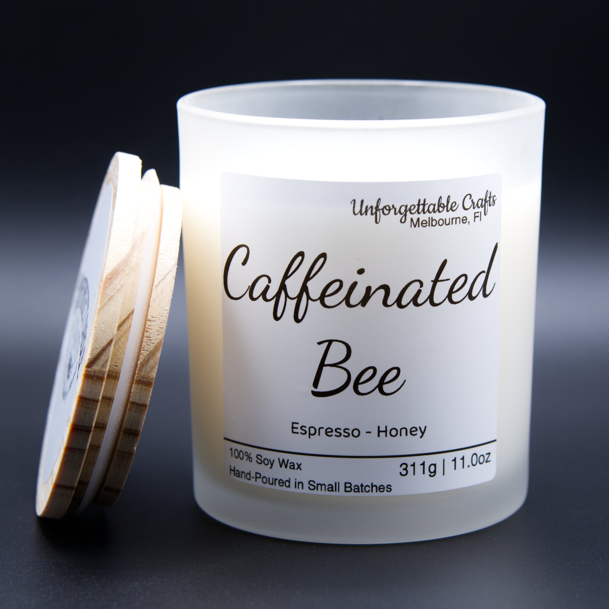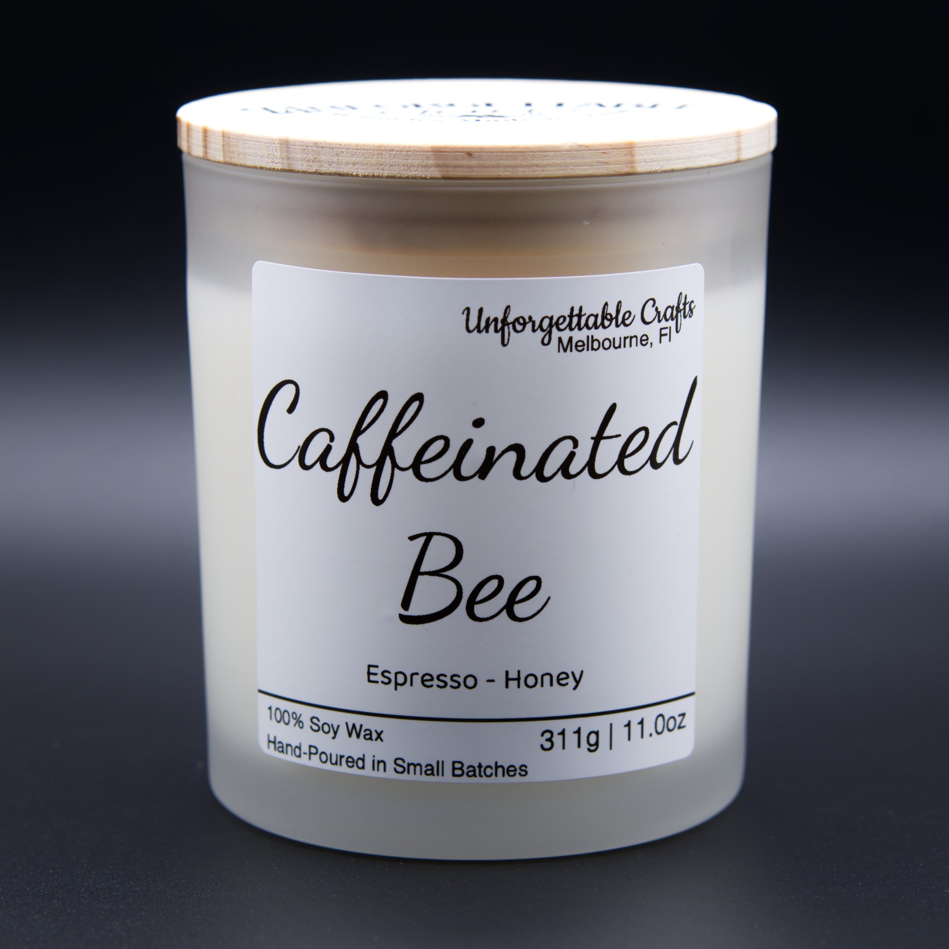 Awaken your senses with the rich, comforting aroma of the Caffeinated Bee frosted glass candle. Made with 100% soy wax, this hand-poured candle blends warm, indulgent notes inspired by your favorite morning brew.